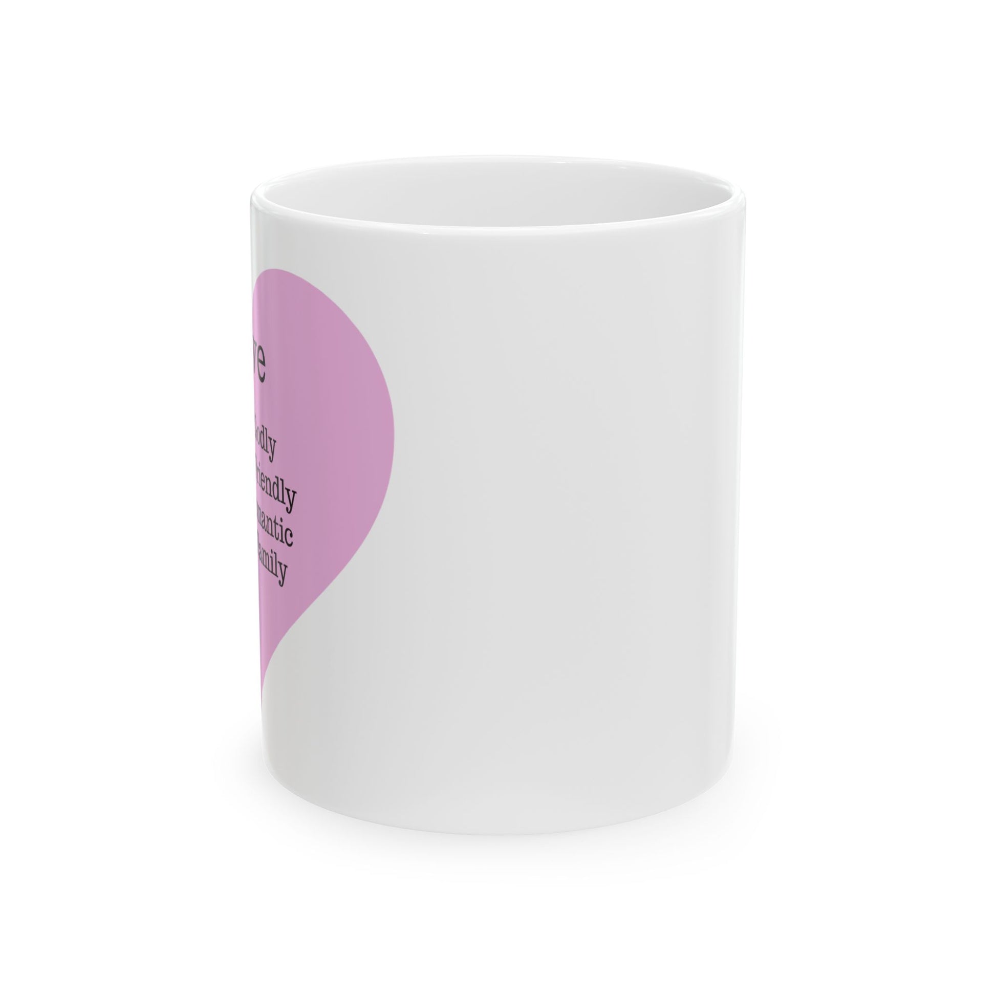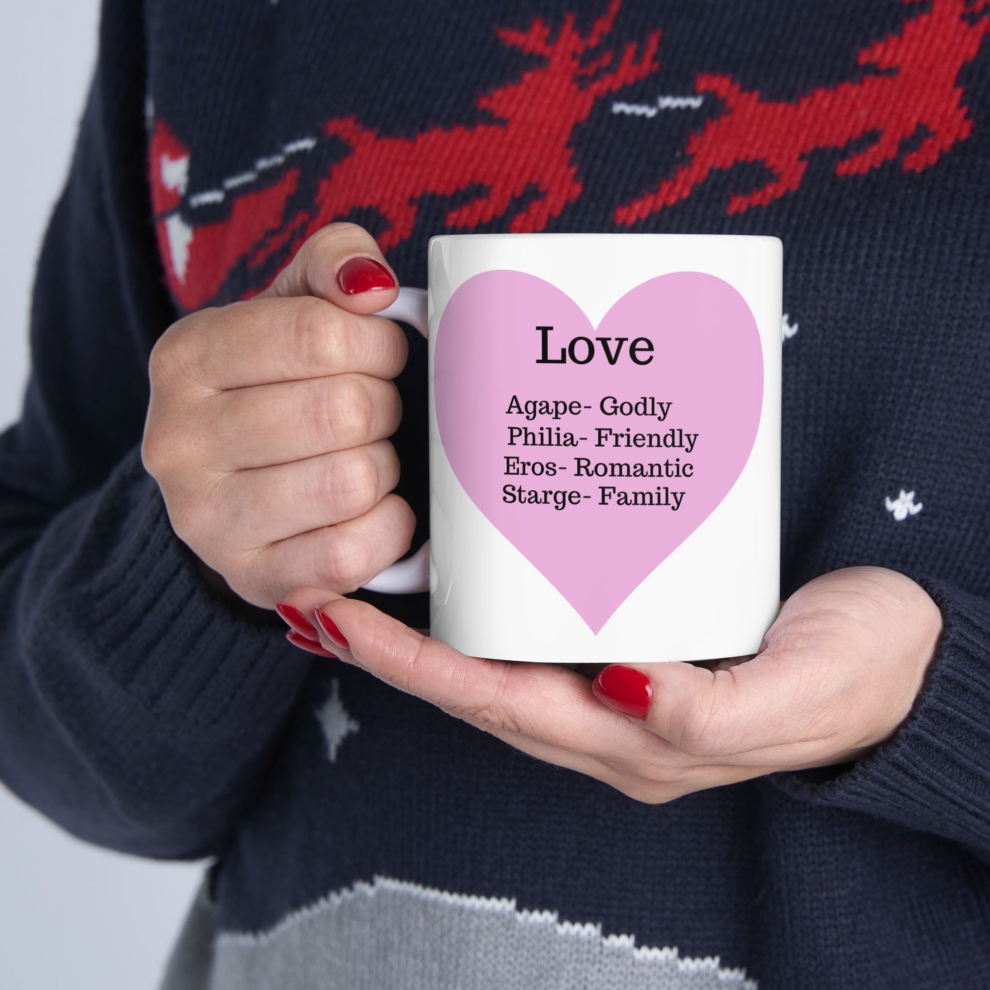 Transform your morning coffee into a moment of pure intention. This glossy white ceramic mug features a soft pink heart that wraps around the side, revealing the ancient Greek definitions of love as you sip. Designed with a comfortable C-handle and a vibrant, long-lasting print, it’s the perfect companion for slow mornings and quiet reflection. Whether you choose the 11oz for a quick pick-me-up or the 15oz for a deep tea session, this mug is a gentle reminder of what truly matters.