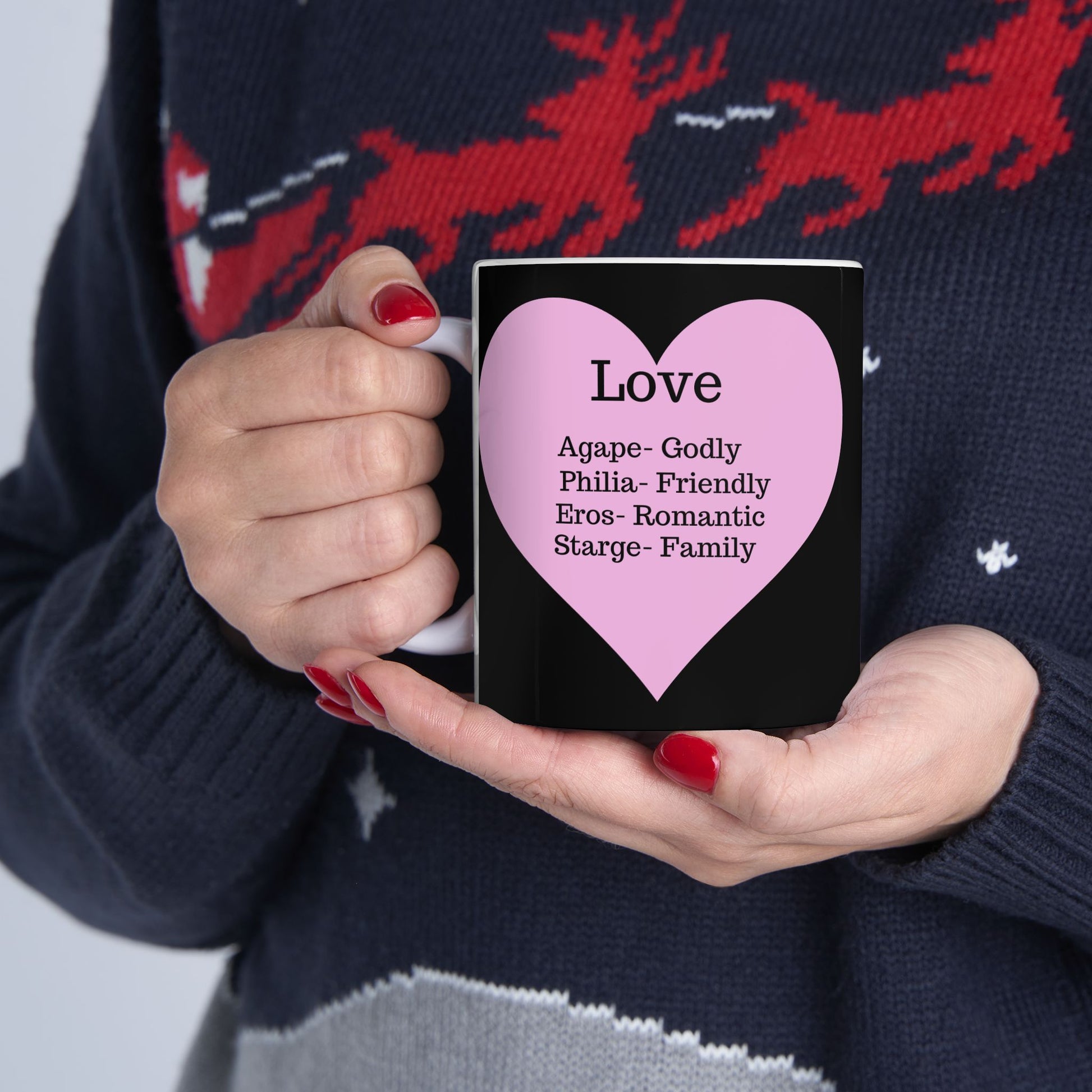 Transform your morning coffee into a moment of pure intention. This glossy white ceramic mug features a soft pink heart that wraps around the side, revealing the ancient Greek definitions of love as you sip. Designed with a comfortable C-handle and a vibrant, long-lasting print, it’s the perfect companion for slow mornings and quiet reflection. Whether you choose the 11oz for a quick pick-me-up or the 15oz for a deep tea session, this mug is a gentle reminder of what truly matters.