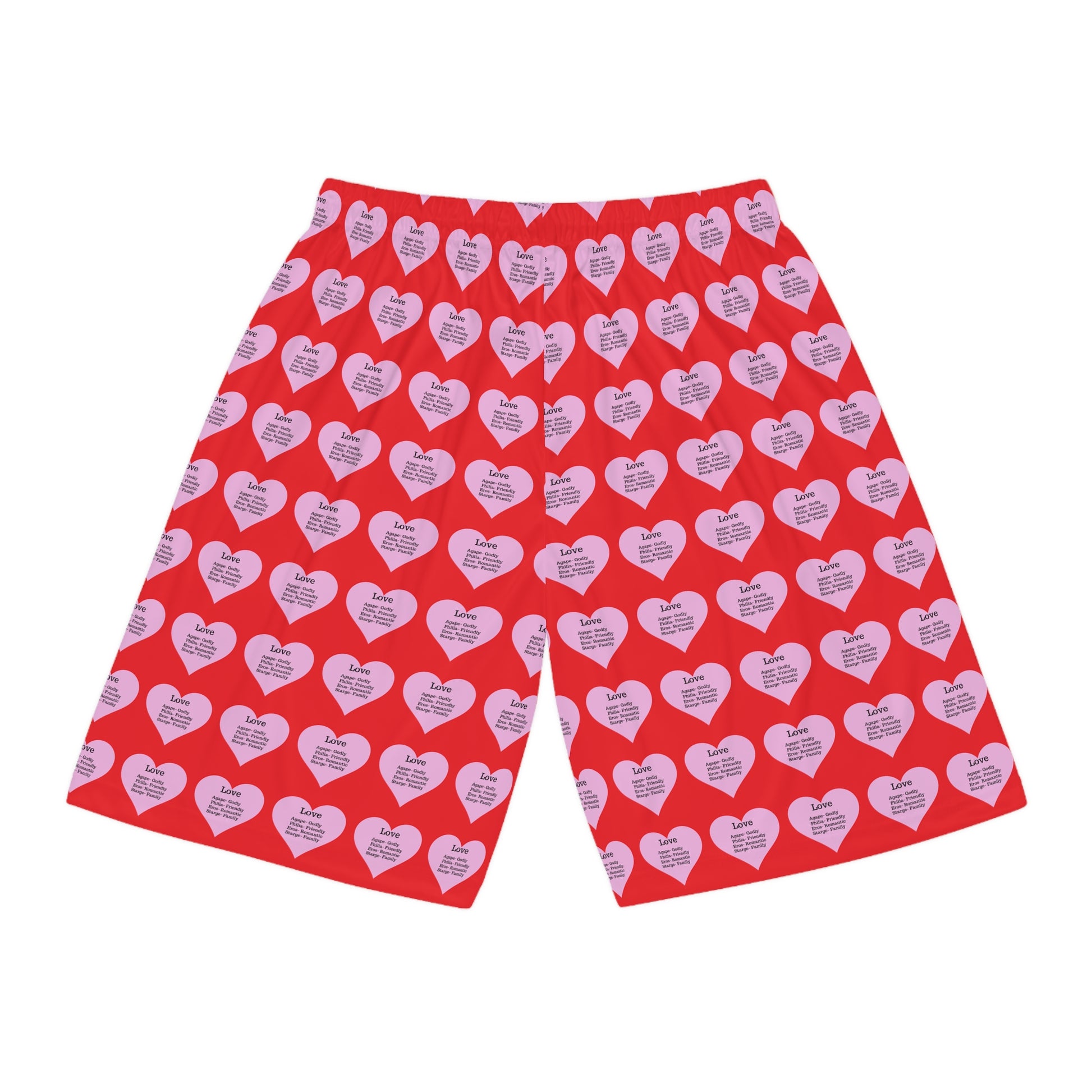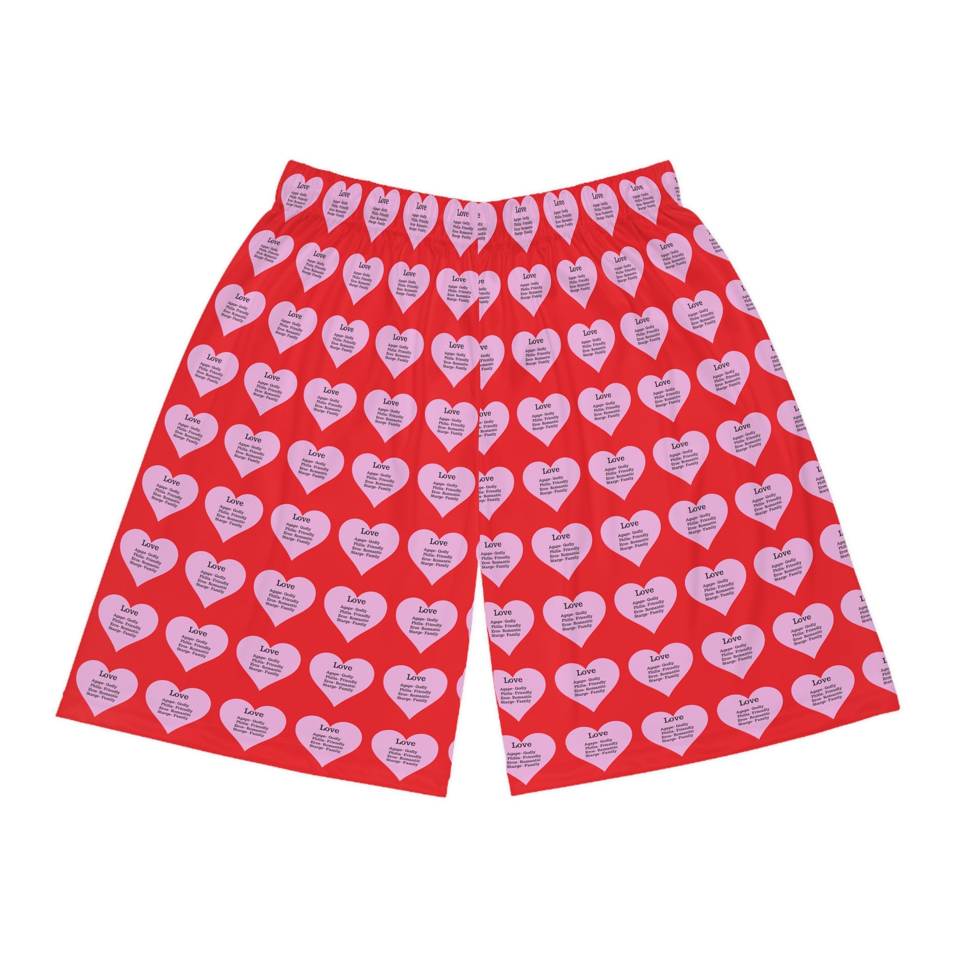The all-over heart pattern adds a meaningful touch, with each heart listing different types of love: Agape (Godly), Philia (Friendly), Eros (Romantic), and Starge (Family). This design is perfect for anyone looking to express a unique and personal style. An elastic waistband with an inner drawstring provides an adjustable and secure fit. Versatile and easy to wear, these shorts fit seamlessly into an active lifestyle or relaxed days, making them a great addition to your wardrobe.