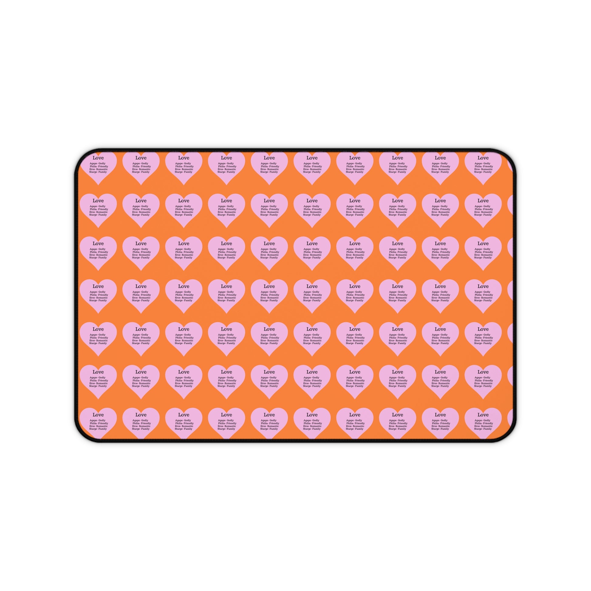 Bring a touch of whimsy and warmth to your desk with this Love Hearts Desk Mat. Featuring a repeating pattern of pink hearts, each with the word “Love” and other loving phrases, this mat adds a sweet and charming detail to your workspace. It's the perfect way to infuse your day with positive vibes while keeping your desk organized and protected.