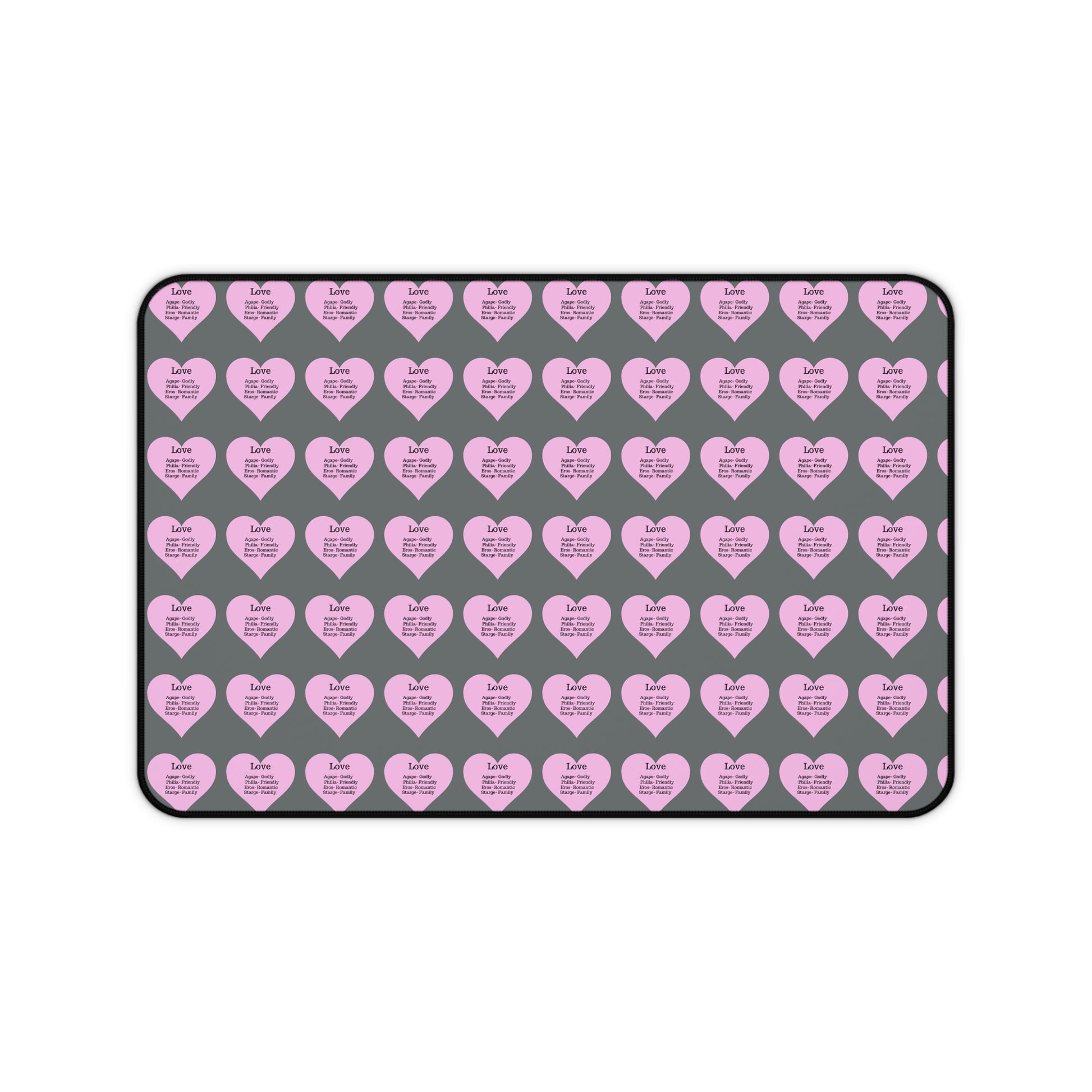 Bring a touch of whimsy and warmth to your desk with this Love Hearts Desk Mat. Featuring a repeating pattern of pink hearts, each with the word “Love” and other loving phrases, this mat adds a sweet and charming detail to your workspace. It's the perfect way to infuse your day with positive vibes while keeping your desk organized and protected.