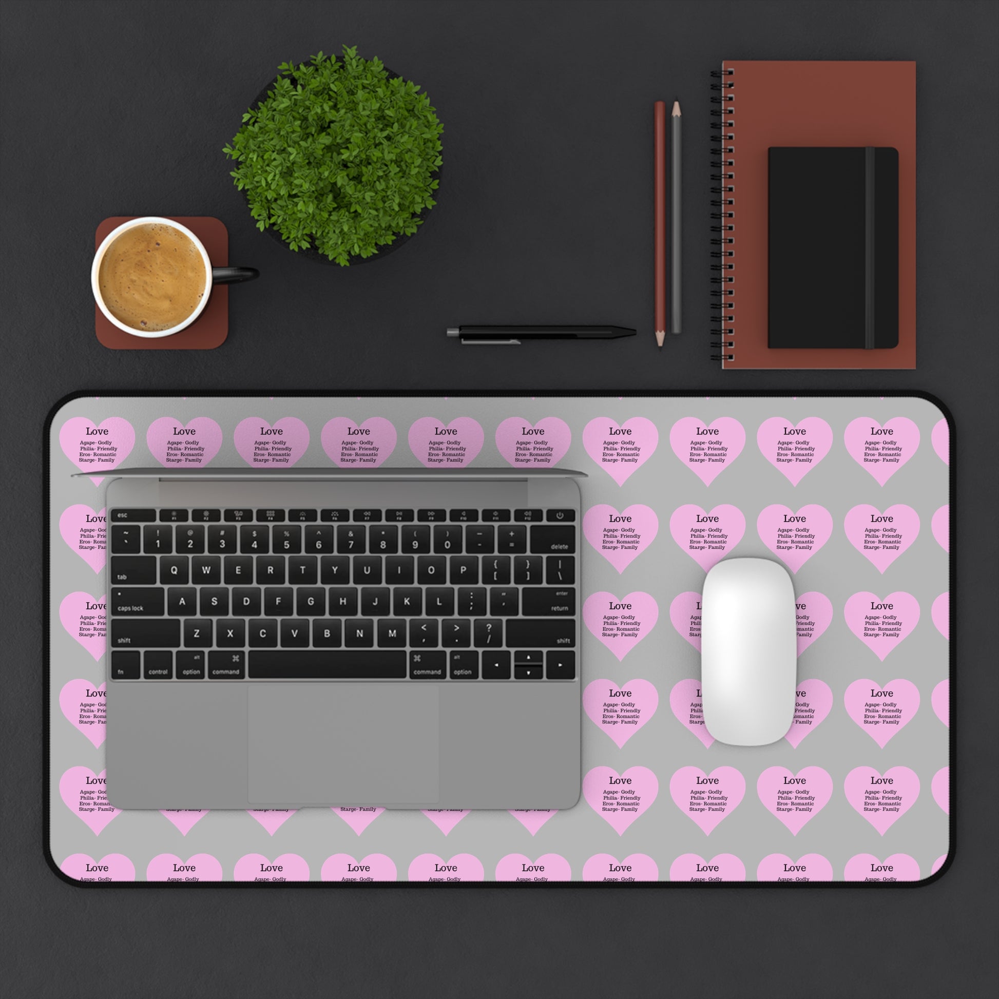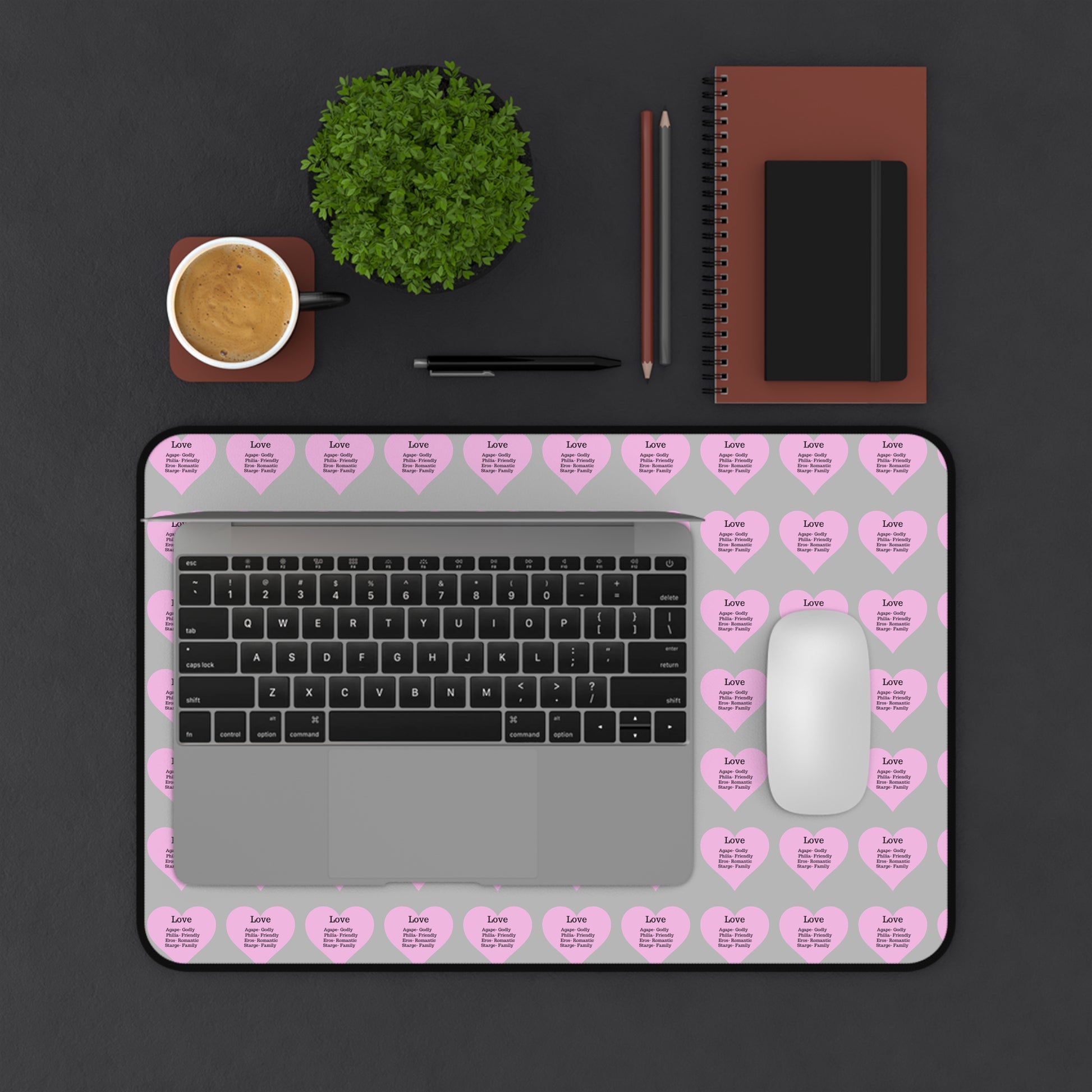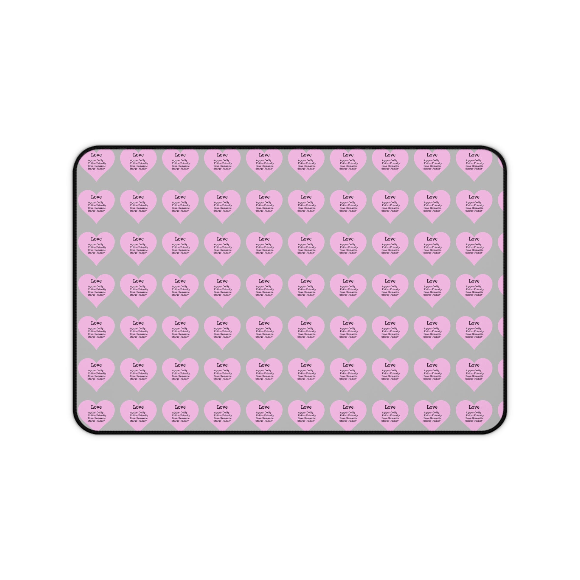Bring a touch of whimsy and warmth to your desk with this Love Hearts Desk Mat. Featuring a repeating pattern of pink hearts, each with the word “Love” and other loving phrases, this mat adds a sweet and charming detail to your workspace. It's the perfect way to infuse your day with positive vibes while keeping your desk organized and protected.