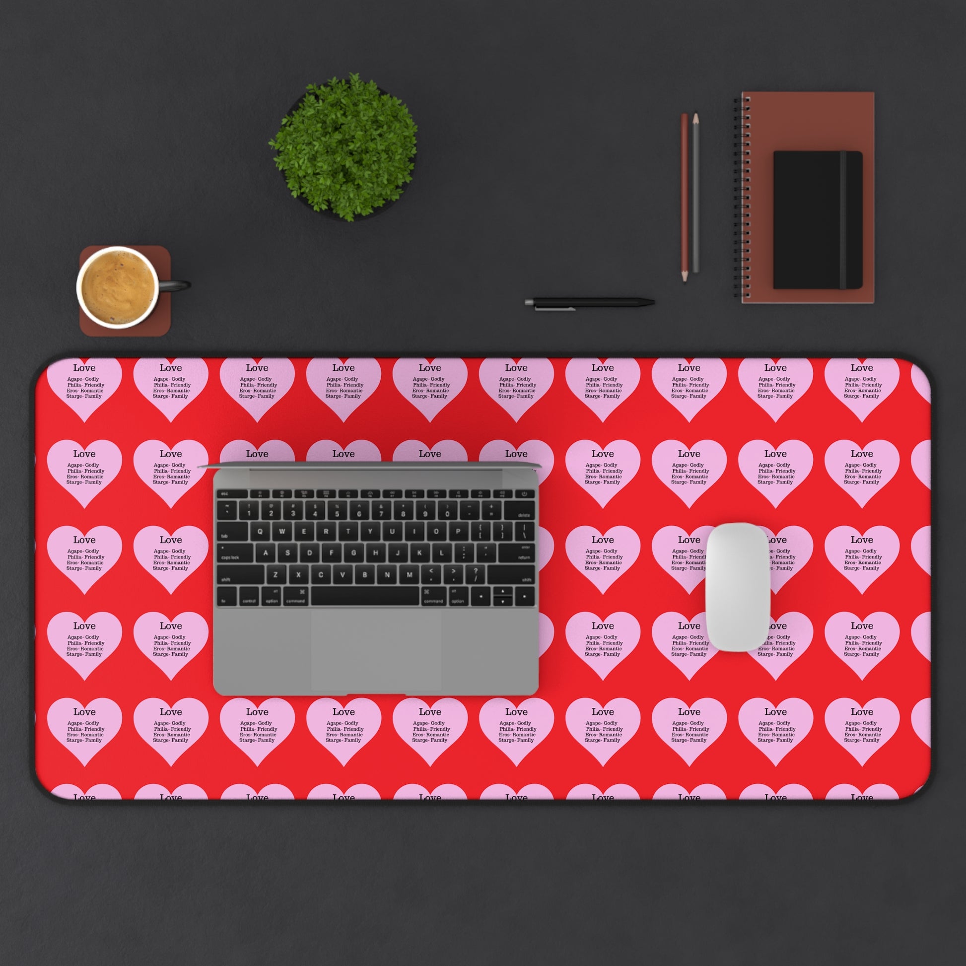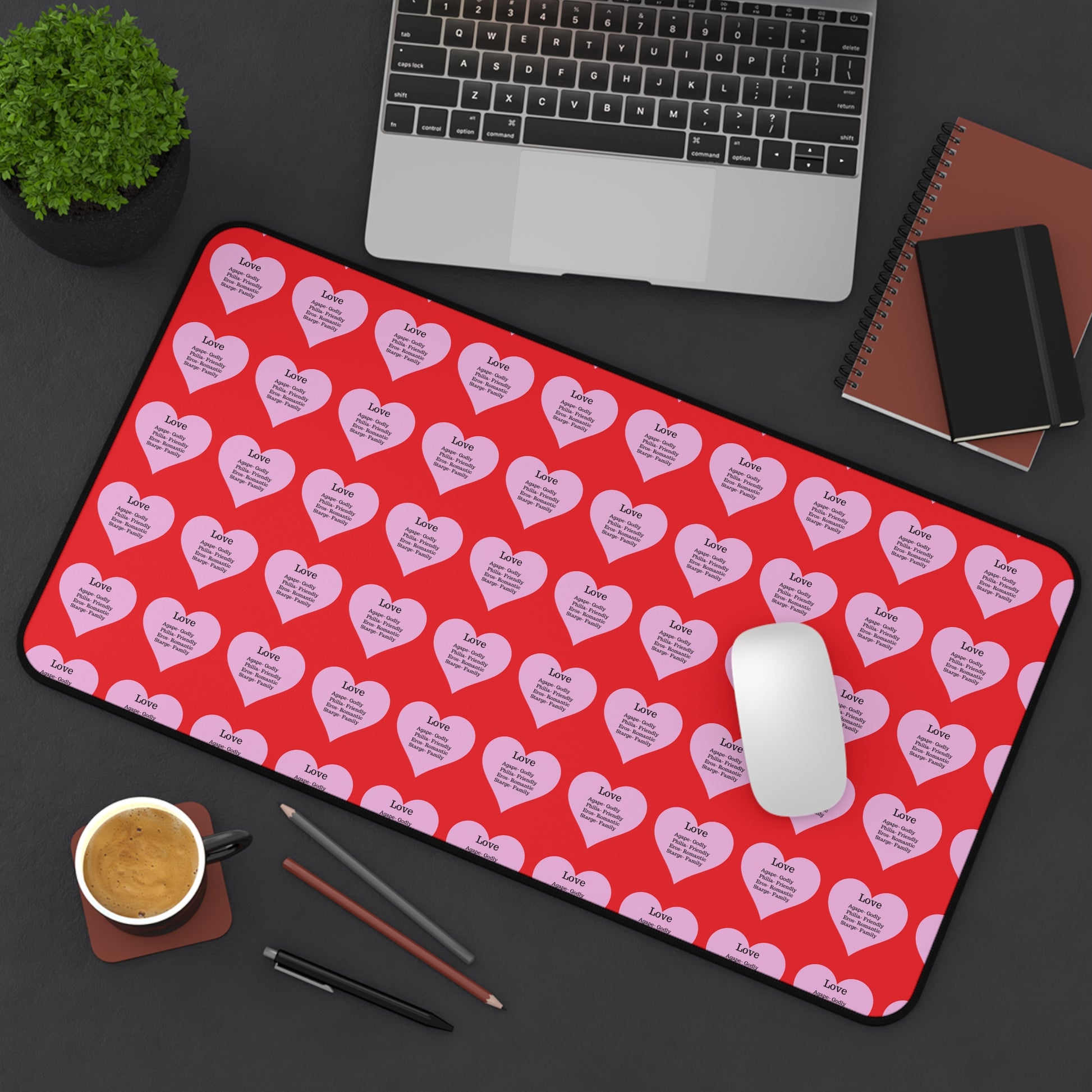 Bring a touch of whimsy and warmth to your desk with this Love Hearts Desk Mat. Featuring a repeating pattern of pink hearts, each with the word “Love” and other loving phrases, this mat adds a sweet and charming detail to your workspace. It's the perfect way to infuse your day with positive vibes while keeping your desk organized and protected.