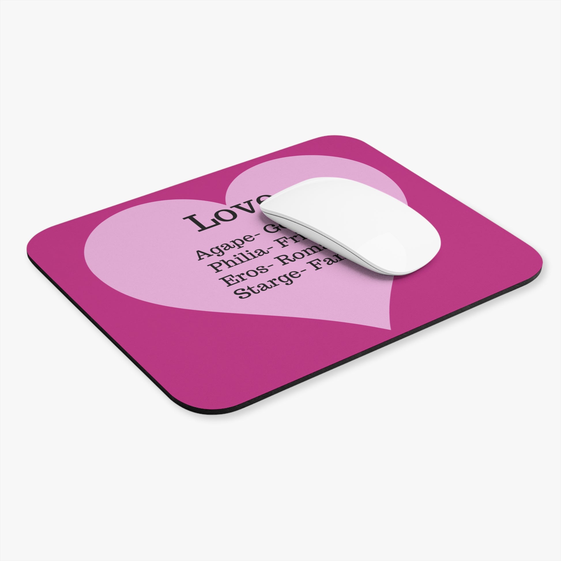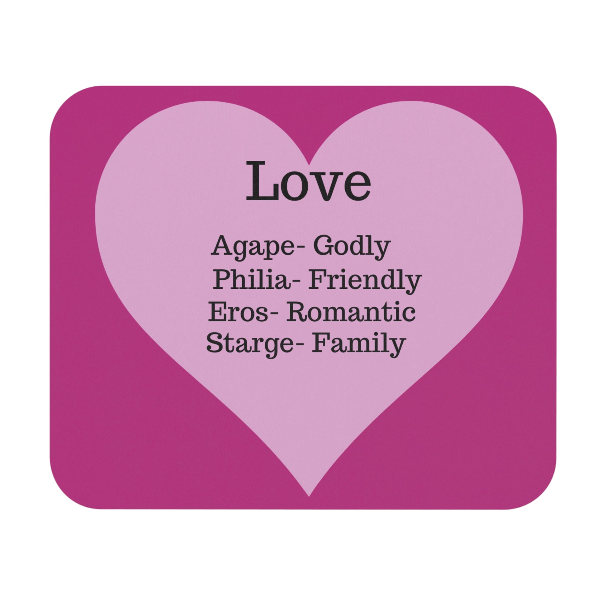 Elevate your desk with this The Four Loves Mouse Pad, a functional and stylish accessory that adds a touch of thoughtfulness to your workspace. Featuring a heart with "Love" at the top, it defines the four ancient Greek types of love: Agape, Philia, Eros, and Storge. This mouse pad is a great way to add a bit of personality to your desk while reminding you of the different forms of affection.