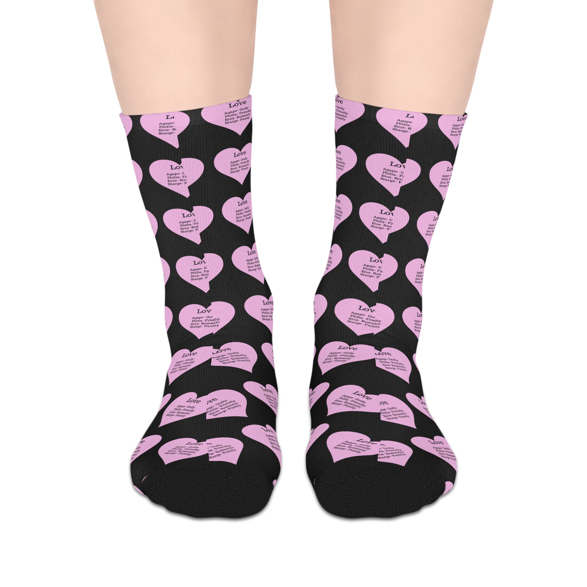 Wrap your feet in comfort and love with these mid-length socks. Made from a soft, high-quality polyester, they offer a cozy and durable fit for everyday wear. The all-over print features a charming pattern of hearts, each one with a thoughtful message about the different types of love: Agape, Philia, Eros, and Storge.