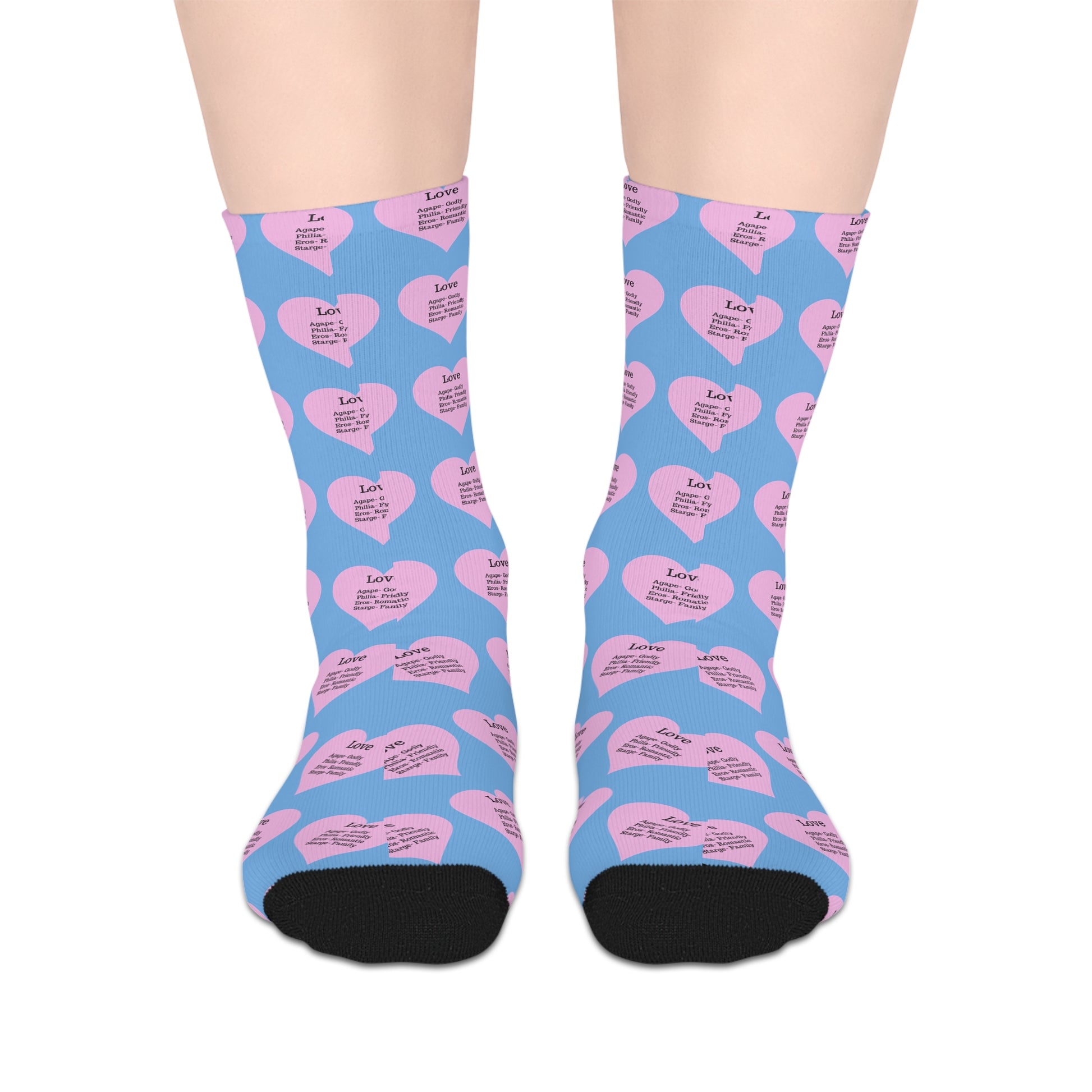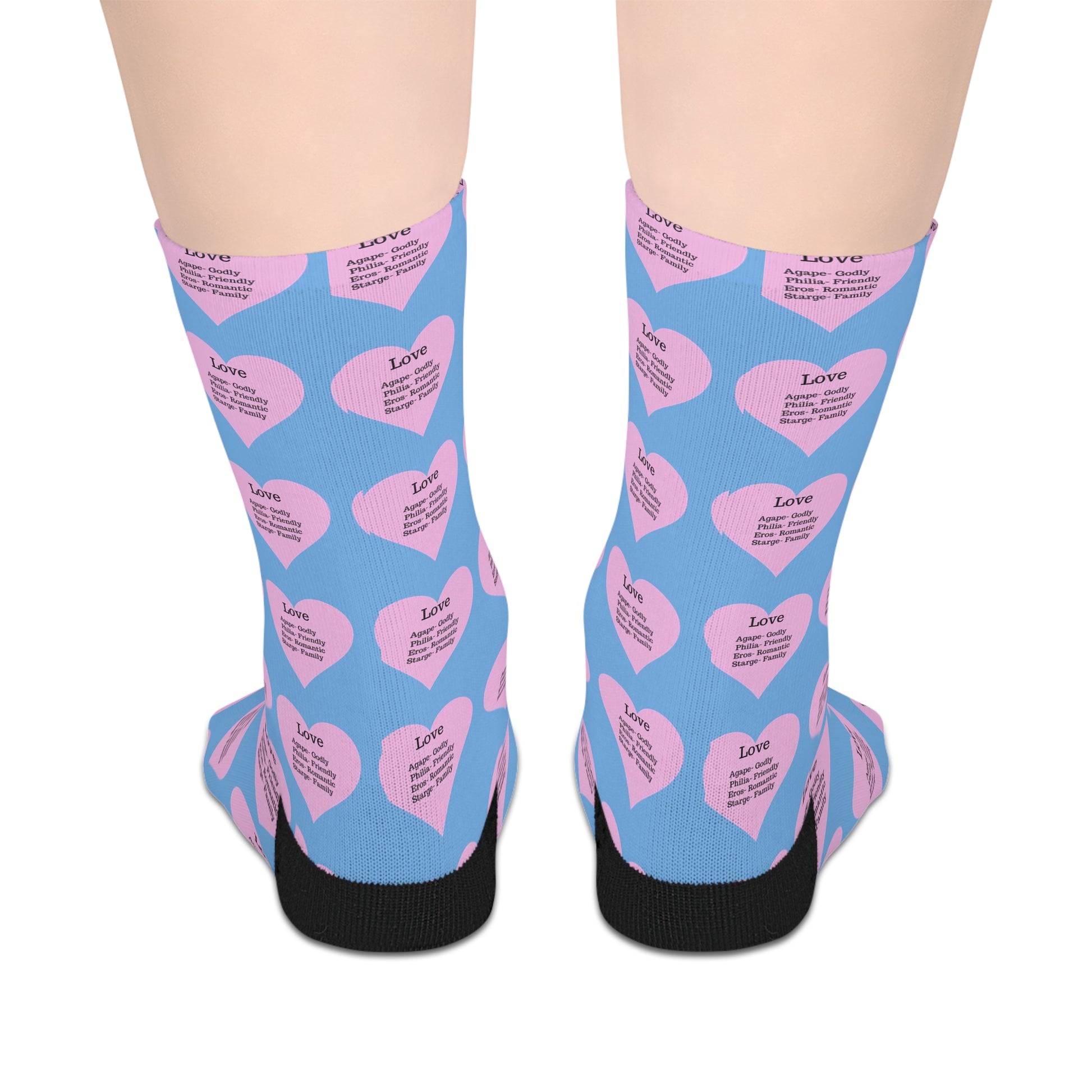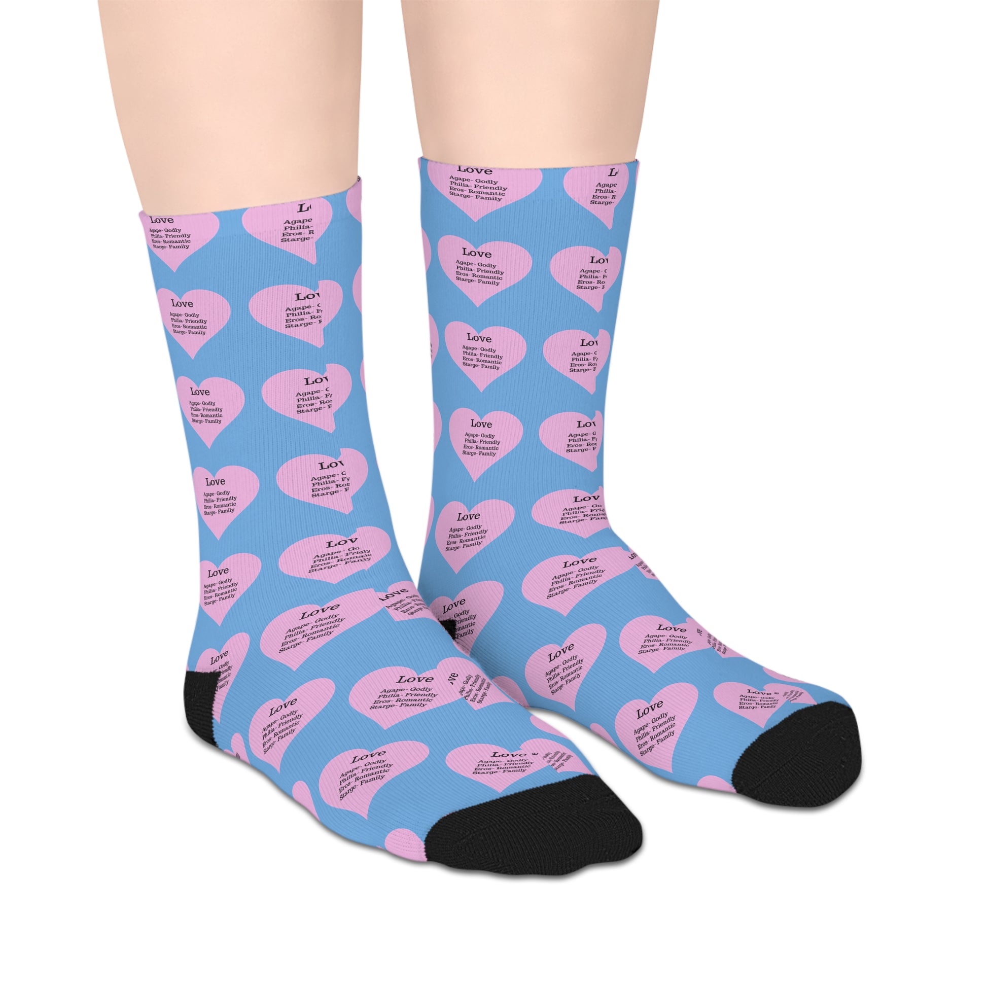 Wrap your feet in comfort and love with these mid-length socks. Made from a soft, high-quality polyester, they offer a cozy and durable fit for everyday wear. The all-over print features a charming pattern of hearts, each one with a thoughtful message about the different types of love: Agape, Philia, Eros, and Storge.