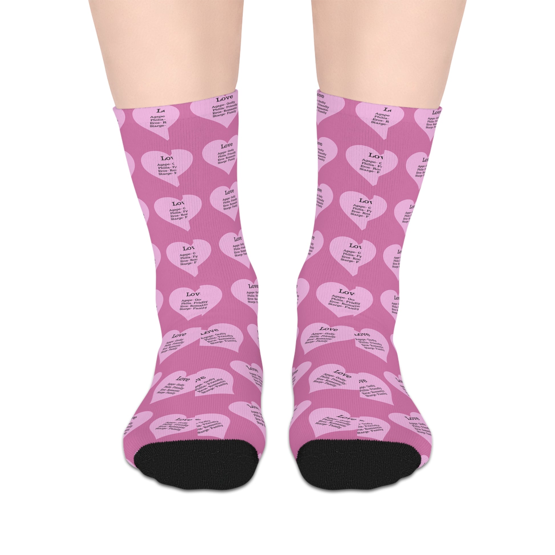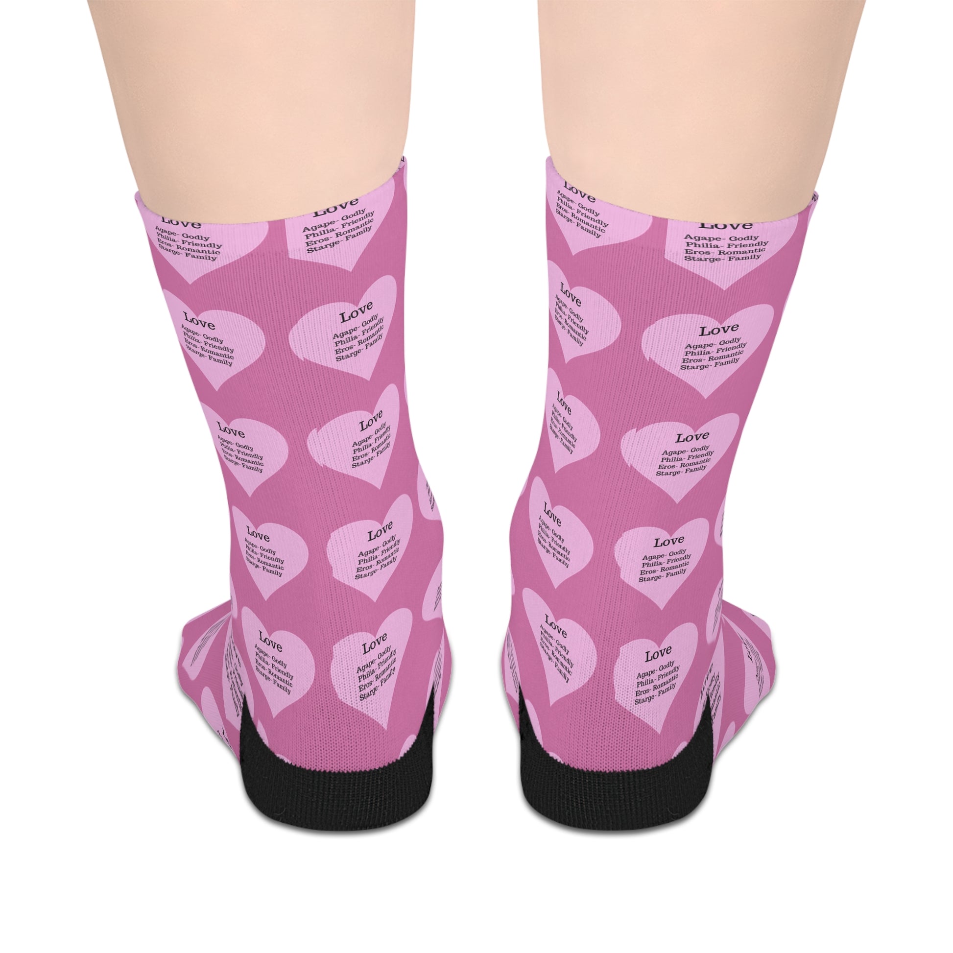 Wrap your feet in comfort and love with these mid-length socks. Made from a soft, high-quality polyester, they offer a cozy and durable fit for everyday wear. The all-over print features a charming pattern of hearts, each one with a thoughtful message about the different types of love: Agape, Philia, Eros, and Storge.