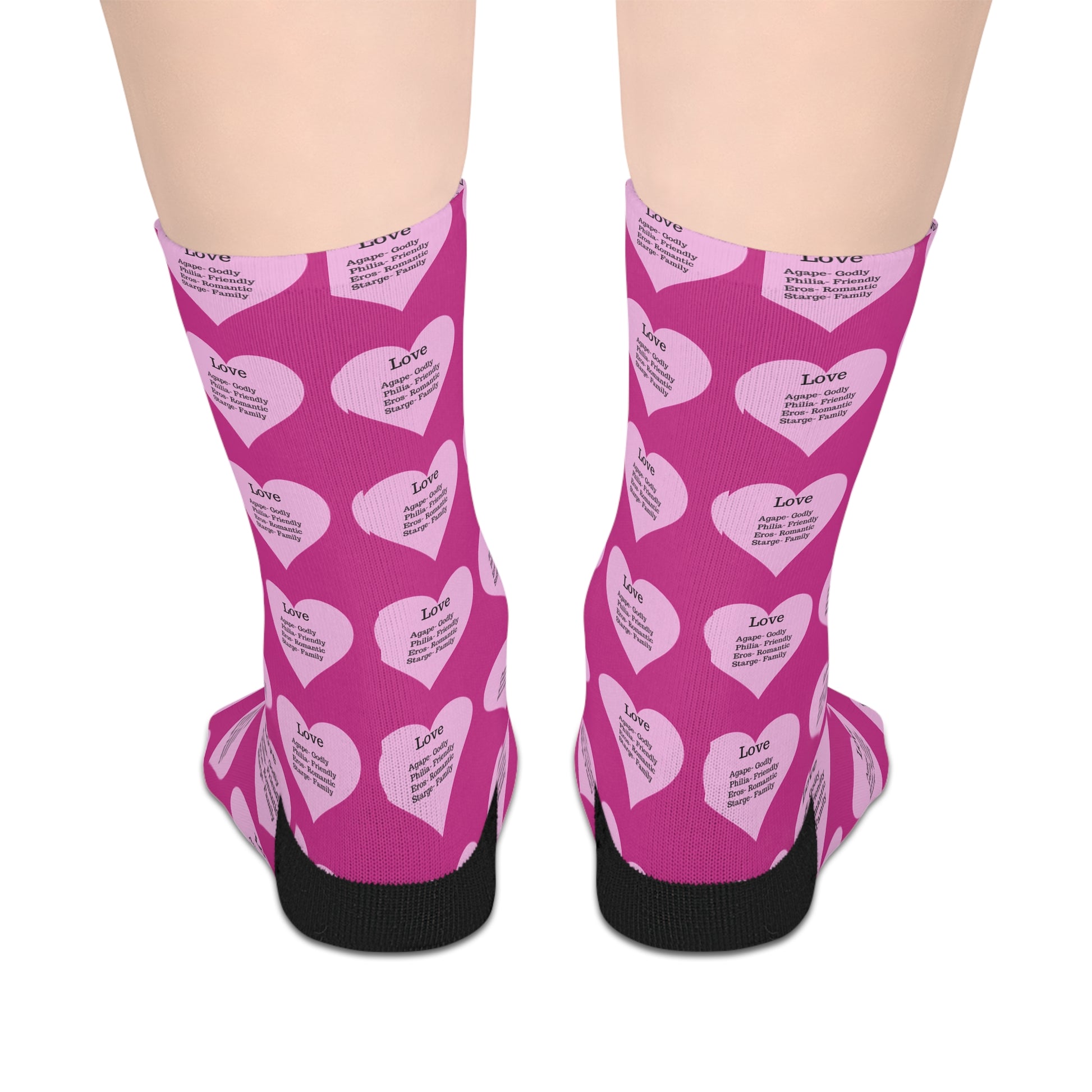 Wrap your feet in comfort and love with these mid-length socks. Made from a soft, high-quality polyester, they offer a cozy and durable fit for everyday wear. The all-over print features a charming pattern of hearts, each one with a thoughtful message about the different types of love: Agape, Philia, Eros, and Storge.