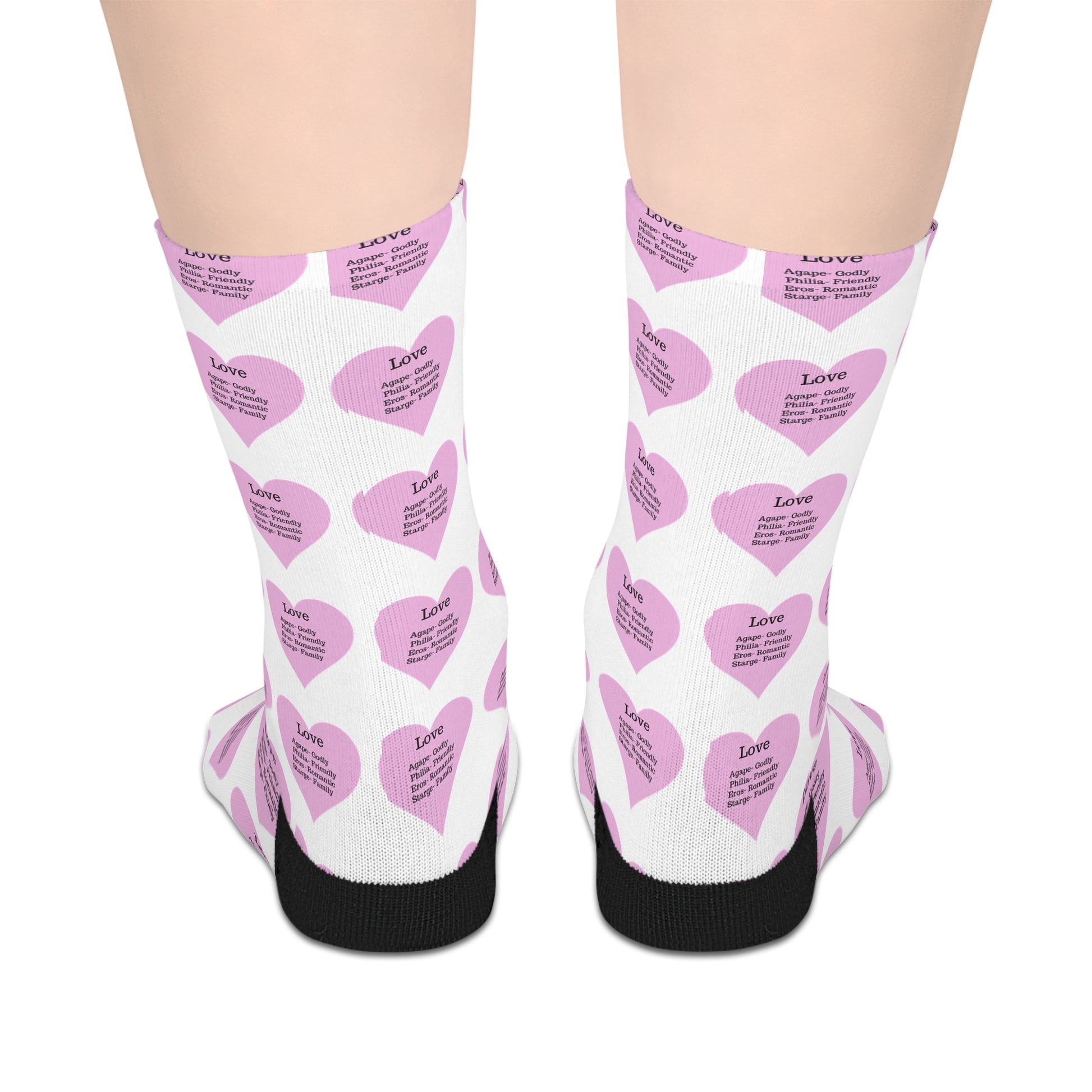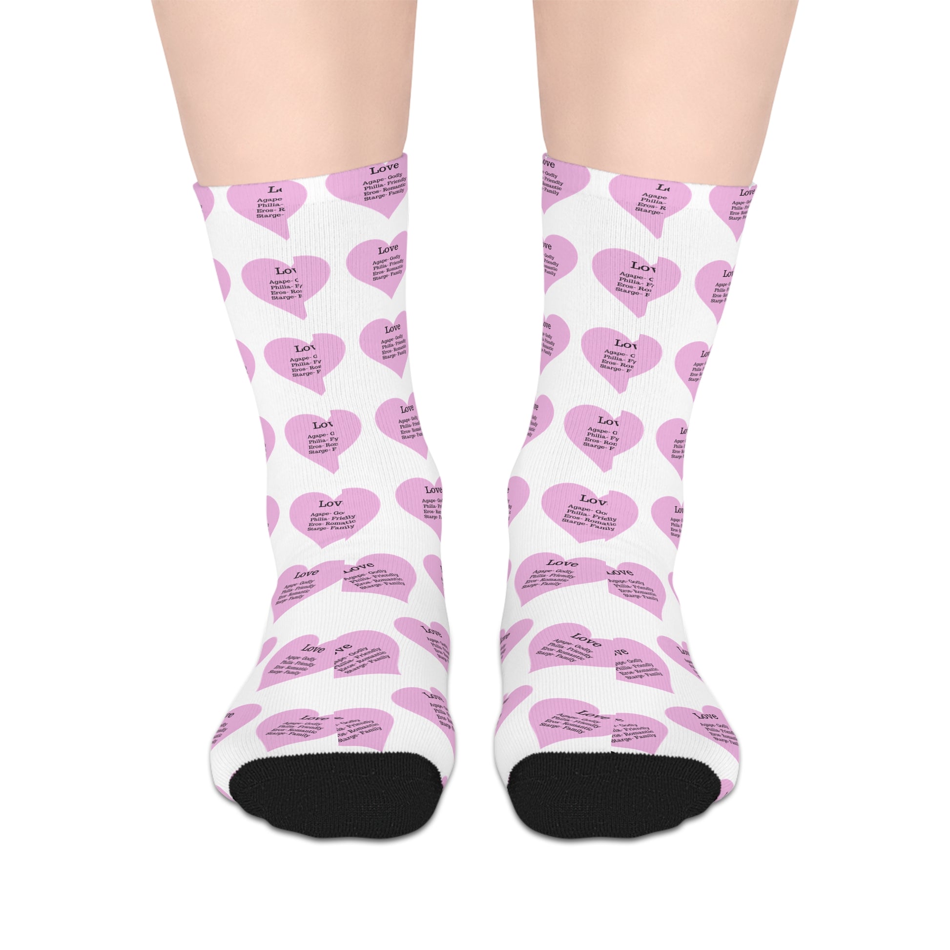 Wrap your feet in comfort and love with these mid-length socks. Made from a soft, high-quality polyester, they offer a cozy and durable fit for everyday wear. The all-over print features a charming pattern of hearts, each one with a thoughtful message about the different types of love: Agape, Philia, Eros, and Storge.