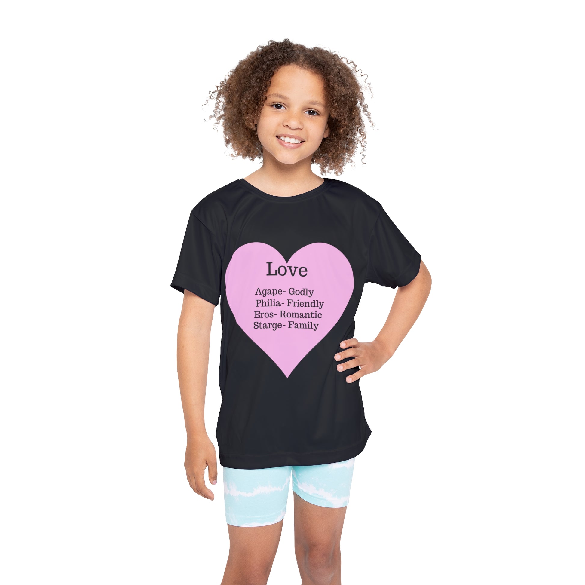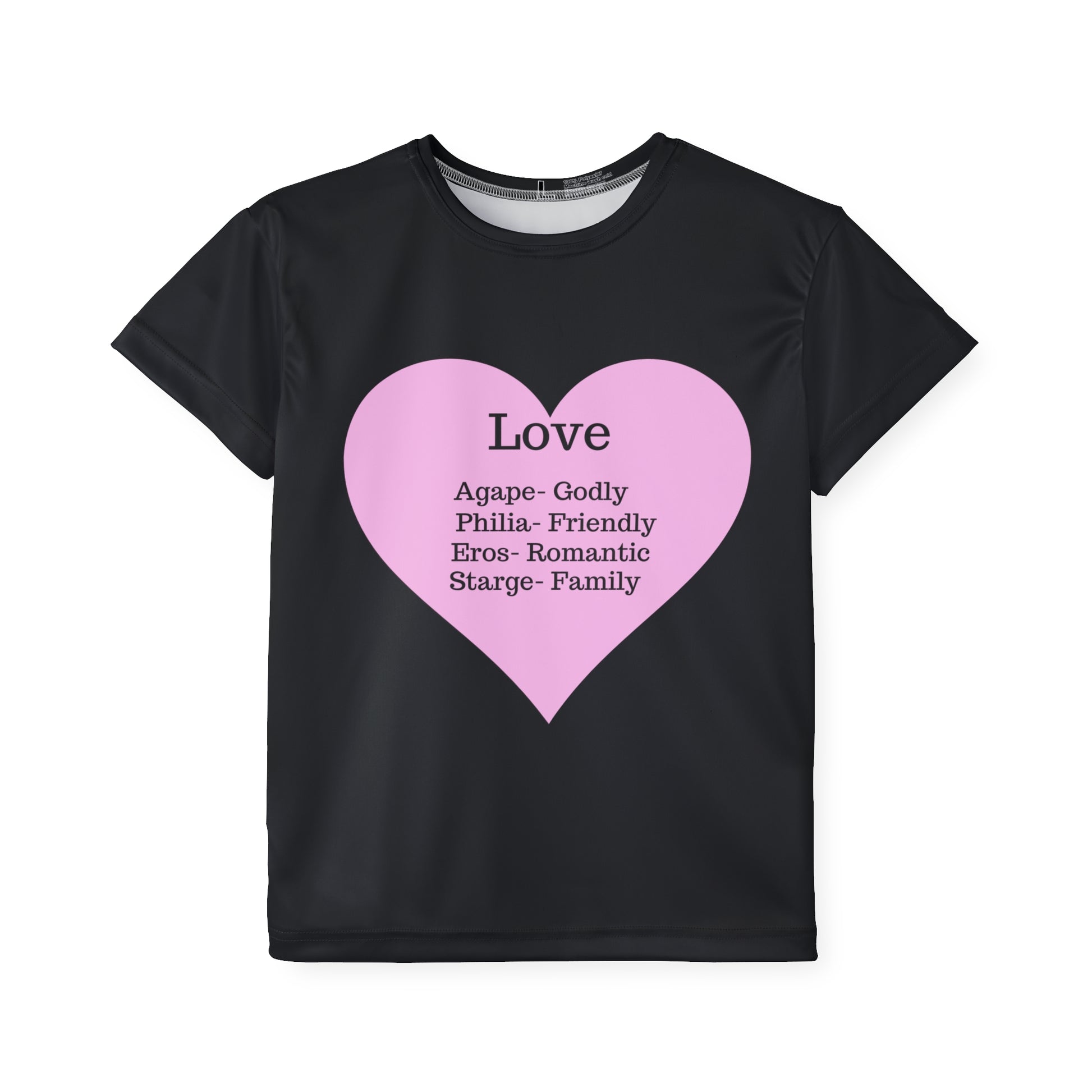 Introducing a vibrant Kids Performance Jersey that’s perfect for young athletes and active kids! With its unique and meaningful design, this jersey brings positive energy and style to every game or outdoor activity. The eye-catching pink heart shares a beautiful message about the different types of love—Agape, Philia, Eros, and Storge—making it a cool way for your child to express warmth and positivity while they play.