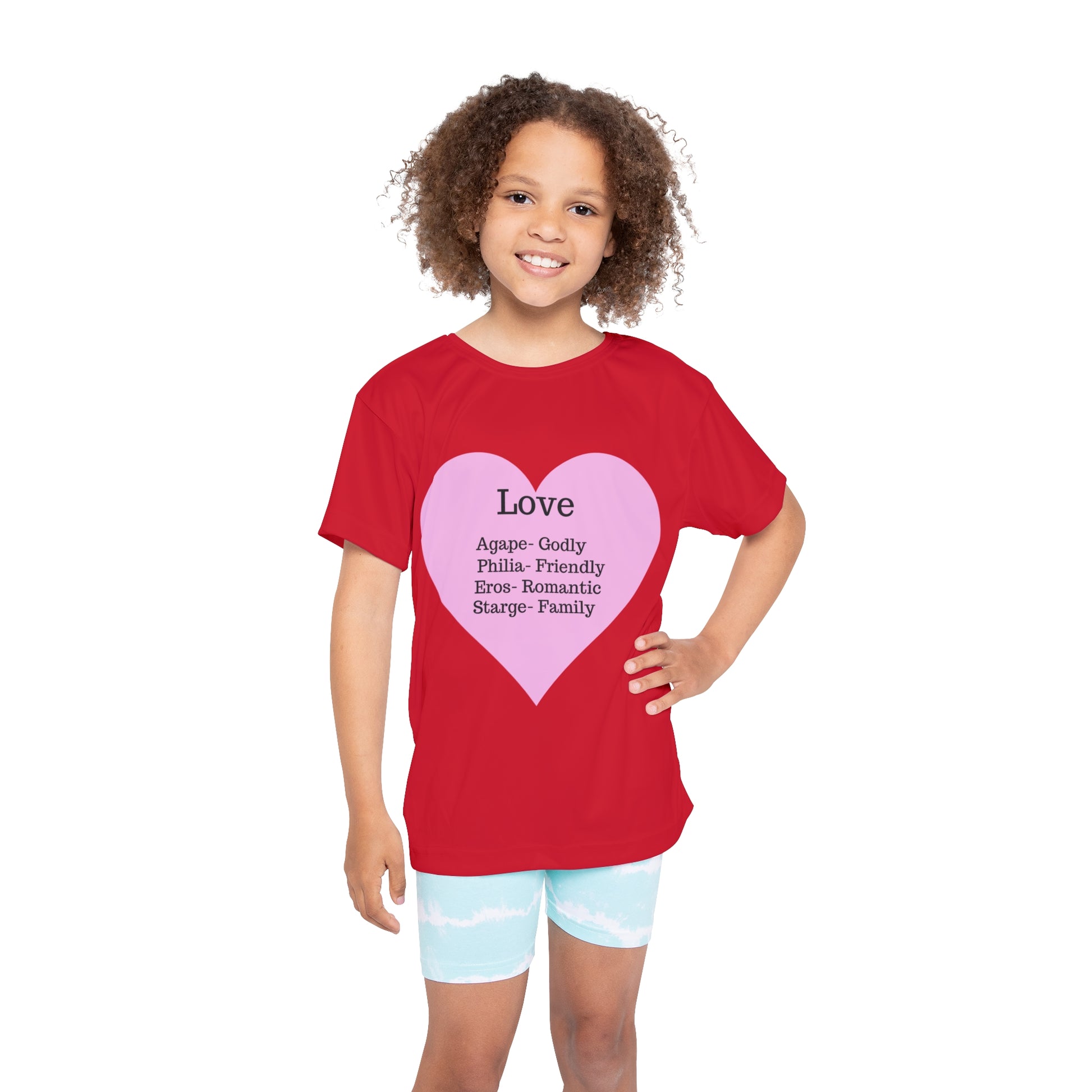 Introducing a vibrant Kids Performance Jersey that’s perfect for young athletes and active kids! With its unique and meaningful design, this jersey brings positive energy and style to every game or outdoor activity. The eye-catching pink heart shares a beautiful message about the different types of love—Agape, Philia, Eros, and Storge—making it a cool way for your child to express warmth and positivity while they play.