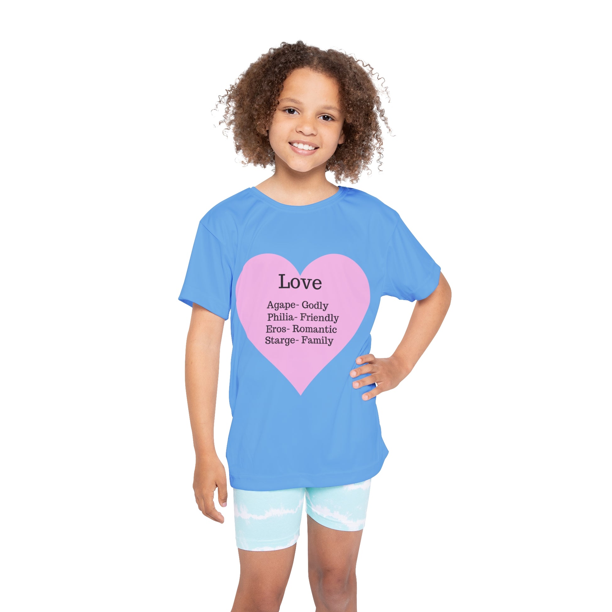 Introducing a vibrant Kids Performance Jersey that’s perfect for young athletes and active kids! With its unique and meaningful design, this jersey brings positive energy and style to every game or outdoor activity. The eye-catching pink heart shares a beautiful message about the different types of love—Agape, Philia, Eros, and Storge—making it a cool way for your child to express warmth and positivity while they play.