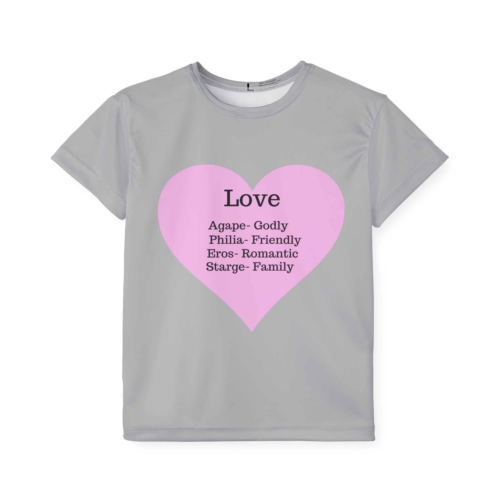 Introducing a vibrant Kids Performance Jersey that’s perfect for young athletes and active kids! With its unique and meaningful design, this jersey brings positive energy and style to every game or outdoor activity. The eye-catching pink heart shares a beautiful message about the different types of love—Agape, Philia, Eros, and Storge—making it a cool way for your child to express warmth and positivity while they play.
